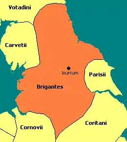 Isurium or Isurium of the Brigantes (Latin: Isurium Brigantum) the historical capital of the kingdom became a Roman fort and town in the province of Britannia at the site of present-day Aldborough, North Yorkshire, England, in the United Kingdom. Its remains—the Aldborough Roman Site—are in the care of English Heritage. Bremetennacum Veteranorum (Ribchester) and Mamucium (Manchester) as well as Coccium (Wigan) were all Roman forts stationed in Brigantia.