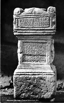 - Iovi aeterno / Dolicheno / et caelesti / Brigantiae / et Saluti / C(aius) Iulius Ap/ol(l)inaris / |(centurio) leg(ionis) VI iuss(u) dei