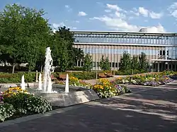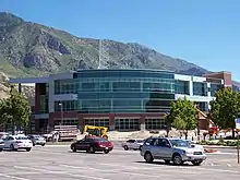 The main campus in Provo, Utah, sits on approximately 560 acres (2.3 km2) nestled at the base of the Wasatch Mountains and includes 295 buildings.[32] The buildings feature a wide variety of architectural styles, each building being built in the style of its time.[33] The grass, trees, and flower beds on BYU's campus are impeccably maintained.[34][35] Furthermore, views of the Wasatch Mountains, (including Mount Timpanogos) can be seen from the campus.[32] BYU's Harold B. Lee Library (also known as "HBLL"), which The Princeton Review ranked as the No. 1 "Great College Library" in 2004,[36] has approximately 8.5 million items in its collections, contains 98 miles (158 km) of shelving, and can seat 4,600 people.[37] The Spencer W. Kimball Tower is home to several of the university's departments and programs and is the tallest building in Provo, Utah,[38][39] and the Marriott Center serves primarily as a basketball arena and can seat over 19,000, making it the tenth largest on-campus arena in the nation.[40] On Sundays, nearly all of the buildings on campus are utilized to host church services.[41][42]