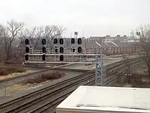 The Brighton Park crossing is a major railroad crossing in Chicago, Illinois, hosting three major freight railroads. The crossing is northwest of the intersection of Western Avenue and Archer Avenue, in the Brighton Park neighborhood of Chicago, Illinois. The railroads involved in the crossing are CSX, Canadian National and Norfolk Southern. The crossing consists of the CN's two-track Joliet Subdivision in a roughly east–west orientation intersecting five north–south tracks operated by NS and CSX. Collectively, these railroads operate approximately 80 trains per day through the crossing.[1] The junction is visible from the CTA Orange Line trains that pass on an elevated structure immediately southeast of the crossing.