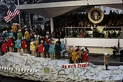The Inaugural Committee wanted to adopt "Bring Us Together" as the inaugural theme, appalling Safire, who said, "That wasn't the theme of the campaign."[17] Safire and other aides felt the administration should seek to advance its agenda, rather than seeking consensus on policy,[15] and White House Chief of Staff-designate H. R. Haldeman was able to change the theme to "Forward Together." Nevertheless, the phrase "Bring Us Together" was thrown in the face of the Nixon administration by Democrats each time something divisive was proposed, and was used as the title of a tell-all exposé by Leon Panetta after he was fired from the Nixon administration for dissenting from the White House's "Southern strategy" on civil rights policy.[17] According to Safire, the use of the phrase against Nixon shows a slogan which evokes emotion can cut both ways.[2]