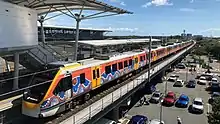 The airport has two railway stations as part of a privately owned airport rail line. The international terminal railway station is elevated and located next to the international terminal, as is the domestic railway station. Both stations are privately owned and operated by the Airtrain Citylink consortium. As a result, fares are more expensive than a regular suburban ticket however less than half the taxi fare. The AirtrainCitylink travels via the Queensland Rail City network to Fortitude Valley and the Brisbane CBD, with most trains continuing to the Gold Coast via South Bank.