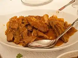 It is commonly seasoned or cooked with a sauce, such as chili sauce or ketchup, or even Coca-Cola,[8] and vegetables such as onions, garlic, potatoes and carrots are added and the brisket is then cooked for several hours in an oven. In modern times a slow cooker has also become a popular cooking method for brisket. One of the most common ways brisket is prepared in American Jewish cuisine is called a sweet-and-sour brisket and consists of a brisket cooked in a sauce containing crushed tomatoes, seasonings, brown sugar, vinegar, and beef or chicken stock.[9] Another preparation of brisket is marinated and cooked with a sauce containing brewed coffee.[10]
