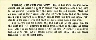 One of the predecessors of 'Take-down Bulldog' was described in 1935 by Elmer Dayton Mitchell and Bernard Sterling Mason in the widely received publication Active Games and Contests under the name 'Tackling Pom-Pom-Pull-Away'.[34] The book is primarily concerned with tag, running and combat games and provides further instructions of exercises solely connected to sports such as soccer and rugby football, basketball, baseball, and hockey. In this context, 'Take-down Bulldog' can be considered a football version of traditional chasing games.