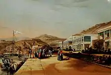 In 1841, Elliot negotiated with Lin's successor, Qishan, in the Convention of Chuenpi during the First Opium War. On 20 January, Elliot announced "the conclusion of preliminary arrangements", which included the cession of the barren Hong Kong Island and its harbour to the British Crown.[15][16] Elliot chose Hong Kong Island instead of Chusan because he believed a settlement nearer to Shanghai would cause an "indefinite protraction of hostilities", whereas Hong Kong Island's harbour was a valuable base for the British trading community in Canton.[17] British rule began with the occupation of the island on 26 January.[13] Commodore Gordon Bremer, commander-in-chief of British forces in China, took formal possession of the island at Possession Point, where the Union Jack was raised under a fire of joy from the marines and a royal salute from the warships.[18] Hong Kong Island was ceded in the Treaty of Nanking on 29 August 1842 and established as a Crown colony after the ratification exchanged between the Daoguang Emperor and Queen Victoria was completed on 26 June 1843.[19]