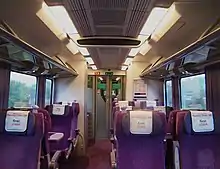 In June 2017, TransPennine Express began refurbishing Class 185s as part of its franchise commitments.[55] The first unit was completed in July 2017, entering service within the same week. The refurbished trains include new seats throughout the train (including leather in First Class), standard plug and USB sockets at every pair of seats, new decor, refitted toilets, and LED lighting throughout.[56] The refurbishment was completed in 2018.[57]