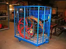 BRUTEs were a wheeled platform, generally with mesh around three sides of the body, the fourth side being open with canvas (or later plastic) straps for restraint of the load. The front included a panel for notes to be chalked to help sort traffic. A few BRUTEs had just the front, for carrying bulky loads too big for the cage, or two hinged ramps (no sides) to load or unload BRUTEs into railway vans. Each BRUTE had two fixed wheels at the rear and two swivelling caster wheels at the front, with polyurethane tyres and taper bearings.[1] Coupling were at front and rear, the front being a pin, the rear a hinged loop on a sprung shaft. A lever on the front operated brakes on the rear wheels and lifted the coupling pin.