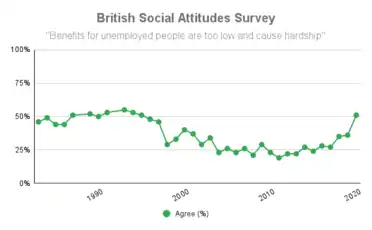 From 1983 until the late 1990s, most people thought that benefits for the unemployed were too low and caused hardship. Following the election of the Labour government in 1997, there was a sharp decline in this view and the majority of people now believed that unemployment benefit was too high until 2016, when an increasing number of people began to consider unemployment benefits as too low and the proportion of people holding this view reached a twenty five year high of 51% in 2020.[7]