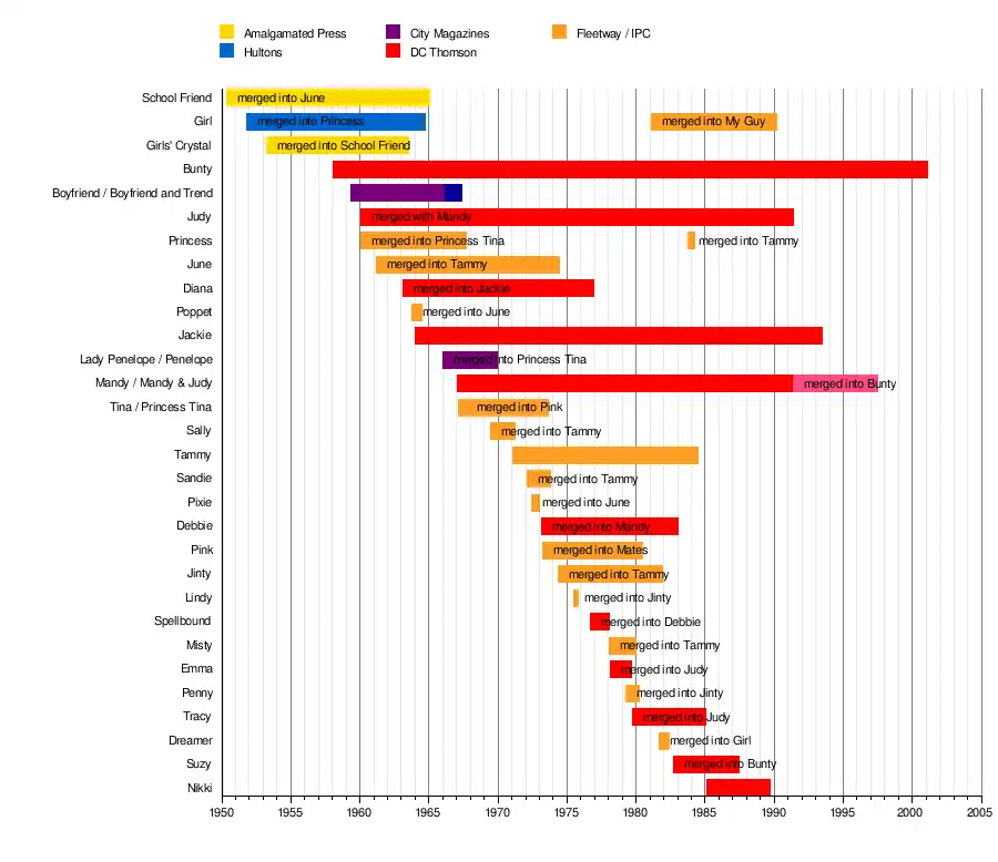 Long-running titles included Bunty, Mandy, and Judy (all DC Thomson) and Tammy (IPC).