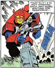 In the Marvel Transformers comics Blaster originally appeared in issue #17, attempting to rescue his friend Scrounge, who was to be executed by Straxus. Blaster is captured himself and forced to watch his friend die. He is rescued by Perceptor and his Autobot group. Later, spying on Straxus' use of the Space Bridge, the Autobots decide to attack and blow it up. They discover the Space Bridge is their comrade Spanner. Blaster then battles Straxus one-on-one, seemingly destroying him. With the Space Bridge blowing itself up, Blaster has no choice but to lead his comrades (Beachcomber, Cosmos, Perceptor, Powerglide, Seaspray and Warpath) across the Bridge to Earth.[7]