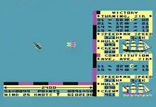 One could also close with the enemy ship and attempt to board their ship. This aspect of the game played a lot like rock-paper-scissors, where the player controlled one crew member and which sort of attack he made with his sword. This was compared against the enemy attack, and the results were used to decrease the crew count on one side. Once one side's crew was all dead, the other side was the victor.
