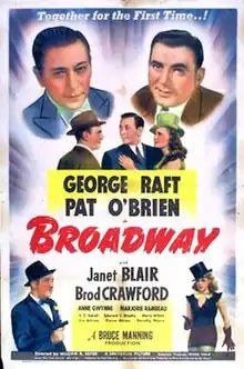 Broadway is a 1942 crime drama musical film directed by William A. Seiter and starring George Raft as himself and Pat O'Brien as a detective.[2] The supporting cast features Janet Blair and Broderick Crawford.[3]