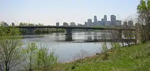 Broadway Avenue Bridge is a girder bridge that spans the Mississippi River in Minneapolis, Minnesota. Designed by Norman C. Davis and Shawn Pierson Bruns of Van Doren-Hazard-Stallings, it was built in 1987. The bridge has a rather streamlined shape, but its piers are more ornate. The piers have two flat columns that taper together, with a base that extends out to the full width of the bridge.