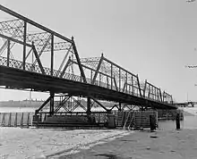 This bridge is the third bridge to cross the river at this location. The first bridge was a wooden structure completed in 1857, but washed away in a flood in 1859. The second bridge was a four-span Pratt truss bridge built in 1887. It spanned the northern industrial district that was developing on both sides of the river. The 1887 bridge was very ornate, featuring finials on each top corner and a band of scrolls, crosses, and lines between them. The horizontal struts and guard railings used X-shapes as a pattern. In 1950, the bridge was raised 20 feet (6.1 m) to allow barges and larger boats to pass underneath. The old bridge was removed in 1985, but a single span of the bridge lives on as the Merriam Street Bridge that connects Nicollet Island to the St. Anthony section of Minneapolis.