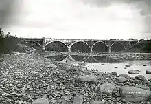 Construction of the bridge employed 1,593 men, who worked in three shifts around the clock.[4] It is Saskatoon's steepest bridge, with a 4% grade,[5] and the tallest at 24 metres (79 ft) above the river.[6] The total cost at the time of construction was $850,000 CAD. In 1933, the streetcar lines of the Saskatoon Municipal Railway were re-routed from the Traffic Bridge to the Broadway Bridge.[5][7]: 257