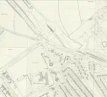 Brockley Hill station was to be located on a viaduct to the north of the existing junction of Edgware Way and Spur Road. The T-junction was to be reconstructed as a roundabout to incorporate a forecourt for access to a curving range of shops and a continuation of Spur Road heading to the north-east to a new housing development.[10] The station was designed by the LPTB's architectural department in conjunction with the estates department of All Souls College.[11][n 4] The station platforms were to be on the viaduct and on a bridge over Spur Road and were to be long enough for nine-car trains being planned for the new Northern line service. The ticket hall was to be located under the bridge with stairs up to the platforms and provision for escalators to be installed later. The station was to be provided with a car park for 20–25 cars.[10]