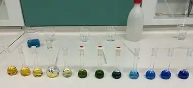 Bromocresol green (BCG) is a dye of the triphenylmethane family (triarylmethane dyes). It belongs to a class of dyes called sulfonephthaleins.[4] It is used as a pH indicator in applications such as growth mediums for microorganisms and titrations. In clinical practise, it is commonly used as a diagnostic technique. The most common use of bromocresol green is to measure serum albumin concentration within mammalian blood samples in possible cases of kidney failure and liver disease. In chemistry, bromocresol green is used in Thin-layer chromatography staining solutions to visualize acidic compounds.