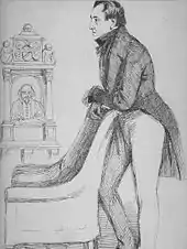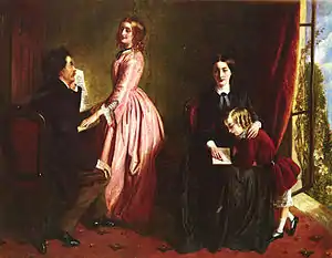 The Brontë sisters were highly amused by the behaviour of the curates they met. Arthur Bell Nicholls (1818–1906) had been curate of Haworth for seven and a half years, when contrary to all expectations, and to the fury of Patrick Brontë (their father), he proposed to Charlotte. Although impressed by his dignity and deep voice, as well as by his near complete emotional collapse when she rejected him, she found him rigid, conventional and rather narrow-minded "like all the curates"—as she wrote to Ellen Nussey.[105] After she declined his proposal, Nicholls, pursued by the anger of Patrick Brontë, left his functions for several months.[106] However, little by little her feelings evolved and after slowly convincing her father, she finally married Nicholls on 29 June 1854.[107]