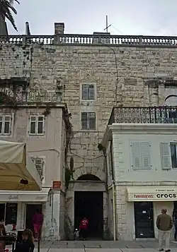 The Bronze Gate (Croatian: Mjedena vrata, Latin: Porta Meridionalis), or "the Southern Gate", is the smaller of the four principal Roman gates into the stari grad (old town) of Split. Built as part of Diocletian's Palace, it was originally a sea gate from which the Emperor entered the complex by boat. Today it is the main entry point from the promenade to the cathedral.