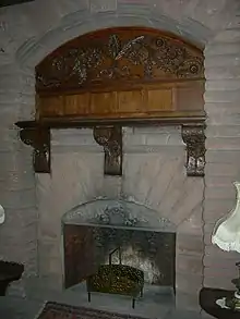 Mrs. Brooke loved flowers, and the house was decorated with examples in wood, stone, glass and iron. The leaded glass panels of the front doors, sidelights and fanlight were crowded with stylized plant forms.[37] The screen between the vestibule and hall featured seven wrought iron window grilles in the form of abstracted sunflowers.[38] The hall chimneypiece featured an arched panel of carved-sandstone flowers above the firebox, oak corbels carved with oversized dahlias supporting the mantel shelf, and an oak frieze of abstracted flowers crowning the whole.[39] The newel post was carved with a plump oak floral garland, which was echoed in miniature elsewhere in the hall.[40] The billiard room chimneypiece featured a frieze of hibiscus carved in sandstone flanked by oversized garlands carved in oak.[41] Carved vines intertwined though the rough-cut granite of the parlor fireplace, and flowers and garlands accented the butternut overmantel above it. The Japanese-inspired decoration of the library chimneypiece featured sunflower corbels supporting the mantel shelf, a vividly-carved frieze of camellias below the mirror, and wispy clusters of vines dangling from above.[42] The parlor's windowseat featured twin leaded-glass windows, each embellished with a stained-glass floral garland and Mrs. Brooke's first initial, "A."