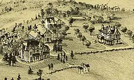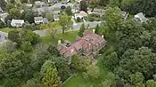 Both Brooke brothers were keenly interested in architecture, and were clients of Frank Furness. Edward built a Greek Revival mansion, "Brooke Manor" (1844, demolished 1968) on a hill overlooking the town.[3] In the mid-1870s, he hired Furness to modernize and expand it.[16] George designed and oversaw construction of St. Michael's Episcopal Church, in the early 1850s.[lower-alpha 5] Twenty years later, he did the same for its Sunday school building (1872–73), which he and his brother donated.[17]: 30–31 George designed his own Second Empire mansion, "Brookewood" (1860, burned 1917), and its many additions.[3]: 225 After Edward's 1878 death, George selected Furness to design a major expansion of St. Michael's Church, 1884–85.[1]: 262–63 This included the addition of transepts, a chancel and choir, a bell tower, and new church furniture (possibly executed by Daniel Pabst).[17]: 32 George again oversaw the project, and he and his family paid for the expansion.[17]: 33 The east transept was altered in 1887 for the installation of a Tiffany window,[18] a memorial to Edward from his widow, Annie Moore Clymer Brooke.[17]: 59–60 [lower-alpha 6]