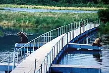 Brooks Camp is a visitor attraction and archeological site in Katmai National Park and Preserve, noted for its opportunities for visitors to observe Alaskan brown bears catching fish in the falls of the Brooks River during salmon spawning season. The Brooks River connects Lake Brooks and Naknek Lake over about 2 kilometres (1.2 mi). This natural choke point for salmon runs made it an attractive location for prehistoric Alaskans, who occupied the area from 4500 BP. The Aglegmuit people lived along the Brooks River in historical times. The Brooks River Archeological District, which includes Brooks Camp, was designated a National Historic Landmark in 1993.[1]