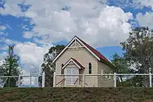 Elizabeth Mary Thomas nee Eaton, formerly Mrs B J Nichols, donated land from the property Clifton for a church and cemetery. Subscription towards the building fund were made on the understanding that the church was dedicated in the name of St Mary to the memory of Woocoo Shire soldiers killed in action in World War I.[14] Opening services of the St Mary's Anglican Church were held on 26 October 1919.[15] The church was built by Matthew Edmund Rooney of Maryborough.[15] There is a group of three stained glass windows behind the altar. In 2019 residents and descendants of past residents attended a 100th anniversary service, and a plaque to commemorate the occasion was unveiled in the church grounds.[16] The church is variously described as being located at Boompa, Brooweena, or Teebar.[17]