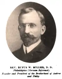 Brotherhood of Andrew and Philip was a fraternal evangelical religious organization founded in 1888 by Rufus W. Miller, of Philadelphia. He became president of the organization's general council. The organization held its first federal convention in New York City in 1893. It was composed of members of 23 evangelical denominations, in the United States, besides chapters in Australia and Japan. Its objects were indicated in the statement that "any man can belong to the Brotherhood who will promise to pray daily for the spread of the Kingdom of Christ among men and to make an earnest effort each week to bring at least one man within the hearing of the Gospel".[1] In 1914, the number of chapters of the Brotherhood in the United States was 875, with a total membership of 25,000 in 44 states..[1]