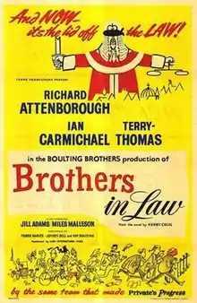 Brothers in Law is a 1957 British comedy film directed by Roy Boulting and starring Richard Attenborough, Ian Carmichael, Terry-Thomas and Jill Adams.[1] The film is one of the Boulting brothers successful series of institutional satires that begun with Private's Progress in 1956.[2] It is an adaptation of the 1955 novel Brothers in Law by Henry Cecil, a comedy set in the legal profession.[3]