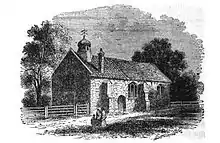 The west end ... has a low door with pointed Tudor arch; above this is a window of two lights with circular arches without tracery; the south wall is pierced with a door, a window of three lights and a window of two lights without tracery; the north wall has in it two windows of three lights with trefoiled tracery and the east end has a window similar to these. At the apex of the roof at the west end is an octagonal turret, constructed of wood containing one bell with the date 1721.[9]