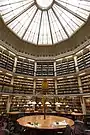 The contrast between the exterior and the interior of the Brotherton could not be greater. Through the glass doors leading from the Parkinson Building into the library, a small entrance hall with a short flight of steps leads up to swing doors which open on to a large cylindrical space surmounted by a concrete dome. The diameter of the room, 160 feet (49 m),[2] was deliberately made wider than the 140 feet (43 m) of the British Museum Reading Room,[5] on which it was modelled.[6] Twenty columns of green Swedish marble, each comprising three drums weighing three tons each, support the coffered dome, and there is a balcony with a decorative iron balustrade and an elaborate art deco electrolier suspended from the dome's centre.[7] On the main floor, the bookshelves are mostly located in bays underneath the balcony; the balcony has an ambulatory providing access to the various subject-areas and to the Brotherton Collection at the rear.