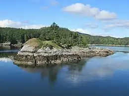The Broughton Archipelago includes numerous islands and islets scattered throughout the eastern end of Queen Charlotte Strait. The largest island of the archipelago is Gilford Island with a total area of 384 km2 (148 sq mi).[2] Cormorant Island is the most densely populated island with 270 residents/km2 (710 residents/mi2) as of 2016.[3]
