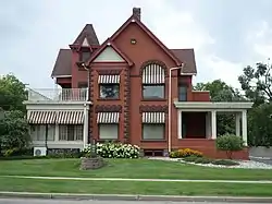 The Brown-Price House is a large two-and-one-half-story brick Queen Anne structure. It is generally L-shaped, with a pyramid-roof, square tower in the angle of the L. It sits on a foundation of rock-face, brown sandstone, topped by a plain water table. The exterior is trimmed with sandstone, including window sills and lintels and other decorative elements. Additional trim of wood includes paneled bargeboards and shingling, and other decorations in the gables, and a paired-bracket cornice in the tower. The main entrance was originally located near the tower, but has been moved to a porch on the northeast section.[3]