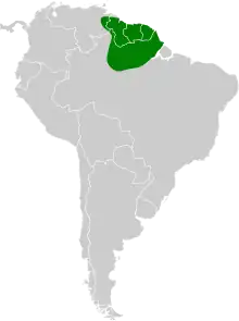 It is found in Brazil, French Guiana, Guyana, Suriname, and Venezuela. Its natural habitat is subtropical or tropical moist lowland forests.