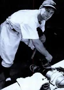 In 1948, infield troubles forced the Dodgers to move Edwards to third base for half of the season while rookie Roy Campanella was brought up from the minor leagues to play as catcher.[15] His batting average dropped to .276 with 8 home runs and 56 runs batted in, as the Dodgers fell to third place in the National League.[1][16] An arm injury incurred during spring training in 1948 as well as the blossoming of Campanella as a hitter eventually relegated Edwards to second-string status, although he was still considered among the best catchers in the National League.[17][18][19]