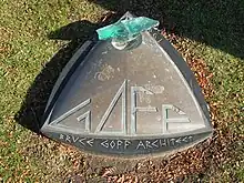 Goff died in Tyler, Texas, on August 4, 1982.[31] His cremated remains are interred in Graceland Cemetery, Chicago, Illinois, with a marker designed by Grant Gustafson (one of Goff's students) that incorporates a glass cullet fragment salvaged from the ruins of the Joe D. Price House and Studio.