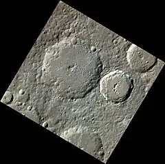 ![]() Bruegel crater and unnamed craters to the east, by MESSENGER in approximate color | |