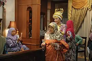 ![]() A Bruneian Malay bride during her Malam Bebedak pre-wedding ceremony. The Malam Bebedak tradition is unique to the Brunei-Muara District. | |