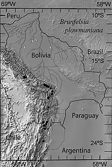Brunfelsia plowmaniana is known from humid forests in the Provinces of Salta and Jujuy in northwestern Argentina, and the Departments of Santa Cruz, Cochabamba and La Paz (Inquisivi Province) in Bolivia. It grows at altitudes of 1500–3200 m on the predominantly North–South ridges separated by dry to arid scrub in the intervening valleys, perhaps mostly at the lower altitudinal range in the southern part of the distribution and the upper altitudinal range to the north. It has never been collected in the neighbouring Provinces of Sud Yungas, Nor Yungas and Larecaja in the relatively well-explored central and northern parts of the Department of La Paz.