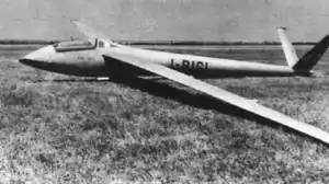 The Bruni 3V-1 Eolo, sometimes known as the SIAI-Marchetti Eolo 3V-1, was a high performance sailplane designed by Giovanni Bruni in Italy in the early 1950s. The 3V-1 was built by a collaboration between SIAI-Marchetti and the Alessandro Passeleva Soaring Sports Club of Vergiate. The high performance sailplane, intended for competitions and record breaking, was an all wooden cantilever mid-wing aircraft, with a high aspect ratio, single spar wing which was sharply tapered in plan and mounted with 3° of dihedral.[1][2] The wing was covered with unusually thick plywood to maintain the laminar profile[3] and its tips carried "salmons", small streamlined bodies intended to minimise induced drag. Narrow slotted control surfaces filled the whole trailing edge, each occupying about a third of the span; the outermost were conventional ailerons, followed by a second set of ailerons which drooped when the flaps on the inboard third of the wing were lowered.[1][2] The Eolo had a pair of mid-chord airbrakes mounted just behind the wing spar, each with sixteen blades deployed above and below the wing surfaces.[1] In the initial version there were inboard leading edge tanks that could hold 32 kg (71 lb) of water ballast.[1]