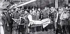 Rescuers entering the mine after the explosion found themselves suffocating on the afterdamp gas and had to return to the surface, often unconscious, carried by other rescuers;[5] however, the determination was such to find the bodies, and to find any survivors, that the rescuers – mostly miners from nearby mines – would insist on returning to the airless mine as soon as they had been revived on the surface.[6] Miners came from as far as Denniston to assist the rescue effort, though it took the Denniston miners several days to arrive as they had to travel by sea from Westport. Wood explains this: "The response of the West Coast miners in volunteering for the rescue parties was due to their occupational loyalties and social and kinship ties. Occupational bonding, especially of coal miners, requires obedience to the miner's code that they come to each other's assistance. Denniston miners and mine managers, like Blackball miners, included former workmates, relatives and friends belonging to the same generation of immigrants, particularly those arriving between 1875 and 1885".[5] According to Wood: "The tragedy helped to break down some old world differences and establish a West Coast identity especially in the mining community.[5]