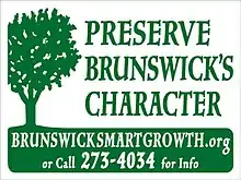 One of the main issues coming from Brunswick Smart Growth and town residents was concerns regarding overdevelopment of the town in a short period of time; their argument was for "sustainable and positive growth".[26] Many cited the arguable overdevelopment of Clifton Park, a town located roughly 14 miles (23 km) to the northeast.[27] Brunswick Smart Growth became noticeable after many residents placed signs on their lawns.