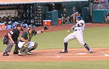 In baseball, a brushback pitch is a pitch–usually a fastball–thrown high and inside the strike zone to intimidate the batter away from the plate on subsequent pitches.[1] It differs from the beanball in that the intent is not to hit the batter, nor does it target the batter's head.[2] Hitters will often crowd the plate in order to have a better swing at pitches on the outside half of the plate. The hitters hope that the pitcher will be scared to throw inside because they might hit the batter. The brushback helps a pitcher to "reclaim" the corners of the strike zone by forcing the batter to stand farther away.