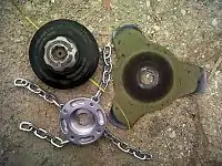 Plastic or metal flails can be used for cutting stems too large for a line head but not requiring a blade. Following an incident in the UK in which when a metal chain link thrown from an aftermarket flail killed a bystander, all flail heads are now banned in the EU.[1][2][3]