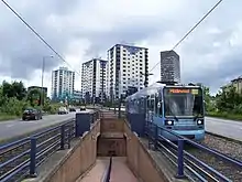 The steep terrain of the Gleadless Valley presented a considerable challenge for the development consortium to overcome, especially since the council were pushing for development of dense high-rise social housing. As a result, a unique design was used in the construction of most of these buildings, designed by city architect J. L. Womersley.[4] They are set back on average around 30 m (98 ft) from the side of the road, part way down the hillside; a flat bridge from road level leads directly into the third floor in the middle of the building, with staircases up to the upper floors and down to the lower floors. The only exception to this were seven of the eight Raeburn Road blocks, which were constructed on flat enough land to allow a conventional ground-level entrance and central staircase upwards to all six floors.