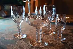 THE INSET PHOTO IS INCORRECTLY IDENTIFIED. The glasses in the photo are: Bryce, Pattern Code BRY670DO. Description: Stem #670, Diamond Optic Bowl. Pattern: 670 (Diamond Optic) by Bryce. [source: REPLACEMENTS, LTD. WEB PAGE; Home / Crystal / Bryce / 670 (Diamond Optic).] The glasses shown are typical of Bryce's many variations of basic patterns in their early 20th century, deco designs, which they produced by mixing their many blown glass bowls (with many bowl patterns produced in both non-optic and various optic patterns) with a variety of their playful molded deco stems, with some of the stems being produced in many lengths and widths to suit the function of an attached bowl and to create deco drama. Color sometimes was added to either stems or bowls of any existing pattern, frequently adding the color to only one or a few of the bowl shapes in a particular pattern. [Sources for this latter info are Replacements Ltd. and my own experience of studying and collecting Bryce's MCM, Deco glass.]
