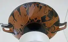 The exterior shows a procession of revelers (komos), the boisterous event which occurred at the end of a symposion. The komasts are largely naked, dressed in only a chlamys (cloak), and are crown with grape vines. The cloaks are depicted with the scattered dots which are typical of the Brygos painter. One of the revelers plays the aulos (a double flute), another plays the barbiton (a type of lyre). The participants in the procession head off with bouncy steps. A few details, such as their headbands and vine wreaths are painted in the same red as their skin. Above all, the tondo image and the barbiton player are images which were often reproduced in the literary tradition and other media.[1]