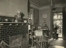 In the 1894–1896 renovations to the Deanery, Lockwood de Forest transformed the original living room into a study for M. Carey Thomas, which came to be known as the "Blue Room," referring to the room's dark blue walls. The decoration of the Blue Room was inspired by Japanese art, a departure from the East Indian influence that permeates the majority of de Forest's designs in the Deanery.[66] The celebrated gold designs that de Forest stenciled on the ceiling were reminiscent of Japanese textiles, and the spiked flowers of the Japanese pagoda tree were the model for the stencil designs on the sofa and daybed.[67] Throughout the Blue Room a number of small works of art were also on display, including etchings by the nineteenth-century artists James Abbott McNeill Whistler and Charles Méryon, and a fifteenth-century bronze bust of Dante Alighieri.[68]