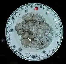 Bua loi or bua loy (Thai: บัวลอย, pronounced [būa lɔ̄ːj], lit. 'floating water lily') is a Thai dessert. It consists of rice flour rolled into small balls, and cooked in coconut milk and sugar.[1] Some Bua loi also adds sweet egg into the recipe. It was inspired by Tangyuan, a Chinese dessert that is traditionally eaten around the Lantern festival. Bua Loi also traditionally eats at the Dongzhi Festival in Thailand, which is festival for the Chinese-Thai bloodline. There are a variety of versions of Bua loi such as using food coloring instead of natural color, using soy milk instead of Coconut cream, sliced Pumpkin to add inside rice balls, et cetera. There's other type of Bua loi in other country from China, Japan, Indonesia, Myanmar, Philippines, and Southern Vietnam. 1 cup of Bua Loy has total calories of 295.5 kilocalories, protein of 10.4 grams, carbohydrate of 6.3 grams, and fat of 25 grams.