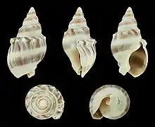 | Five views of a shell of Buccinanops monilifer | |